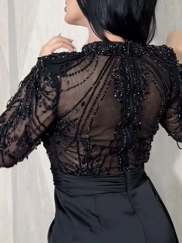 Radiate sophistication with the Midnight Elegance Draped Gown. Featuring an intricately embroidered lace bodice with sheer long sleeves and a deep neckline, this gown flows into a beautifully structured drape with geometric pleat accents. A perfect choice for high-end events where luxury and unique design take center stage.