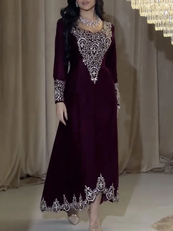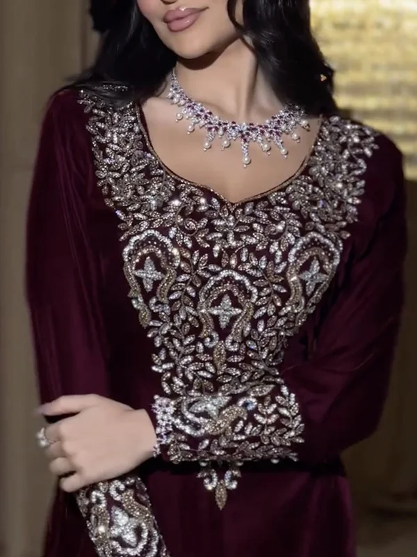 Step into regal elegance with the Royal Amethyst Gown, a breathtaking fusion of deep plum luxury and intricate silver embroidery. The rich, velvety fabric is adorned with exquisite filigree patterns, reminiscent of royal tapestries and timeless craftsmanship. With a gracefully structured bodice and long sleeves that exude sophistication, this gown is the epitome of refined grandeur. Perfect for elite soirées, weddings, and special celebrations, it is designed for the modern queen who carries tradition with a touch of contemporary grace.