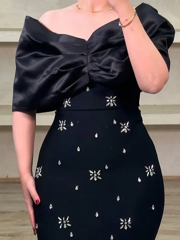 In summary, this dress masterfully combines the theatrical grandeur of the draped shoulder and neckline with the subtle elegance of a fitted silhouette, complemented by shimmering embellishment details, ensuring a classic look that will never go out of style.