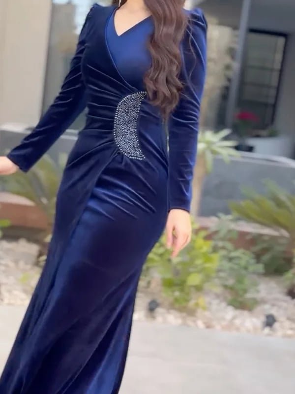 In summary, this dress is the ultimate choice for the woman seeking a statement piece that harmonizes the opulence of its fabric (Velvet) with a bold, contemporary design (the front slit), accented by a touch of refined sparkle (the embellishment).